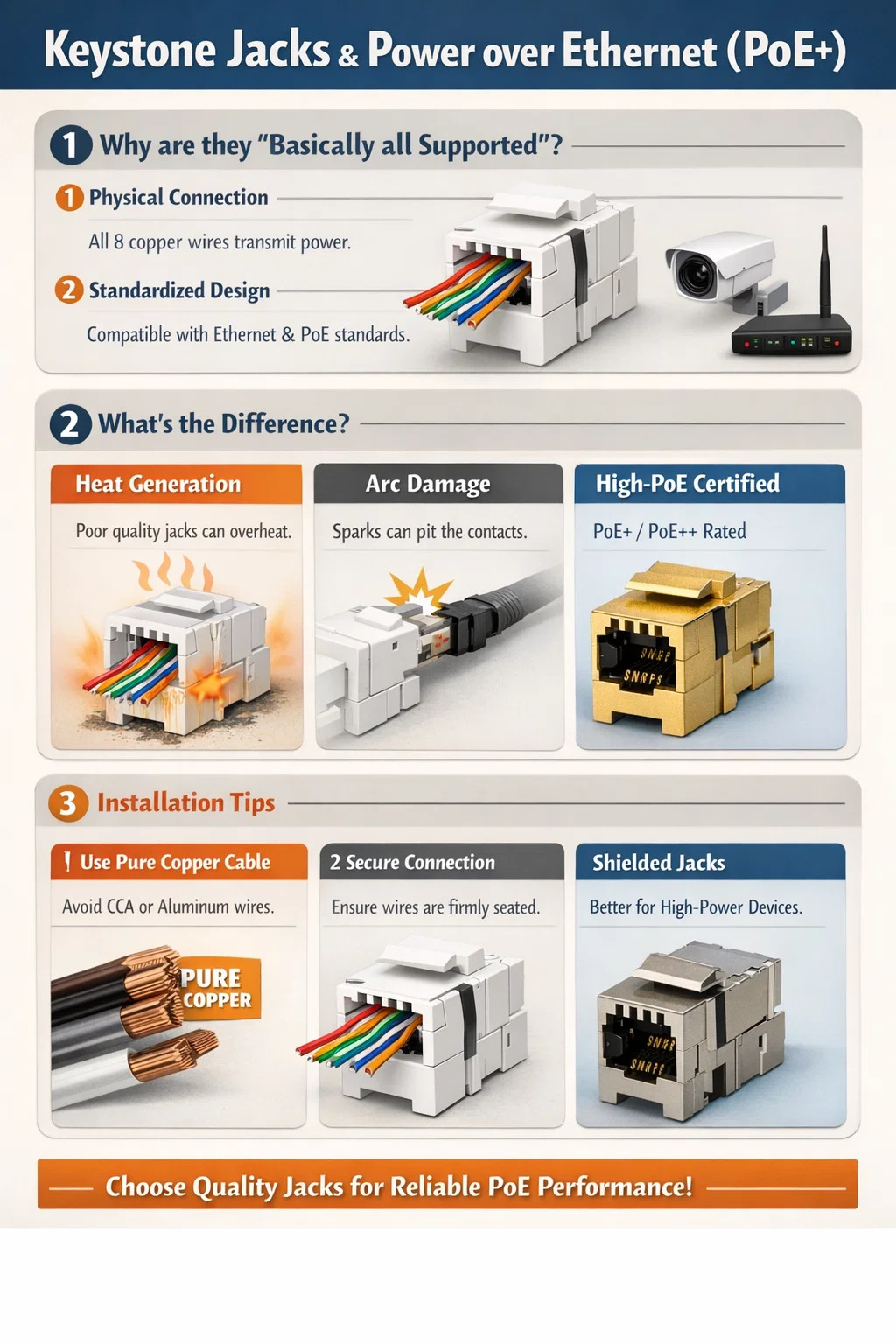 標準的なネットワーク ケーブル コネクタの大部分 ( キーストーンジャック ) は物理的に Power over Ethernet (PoE) をサポートしていますが、実際の高負荷動作においてすべての製品が同様に信頼できるわけではありません。