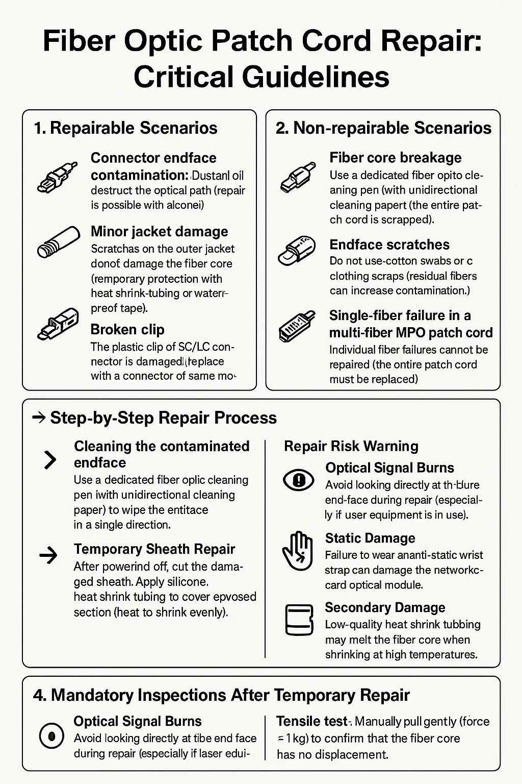 ファイバーコアの破損:過度の曲げまたは圧迫により、ガラス繊維が壊れます(パッチコード全体が廃棄されます)。
