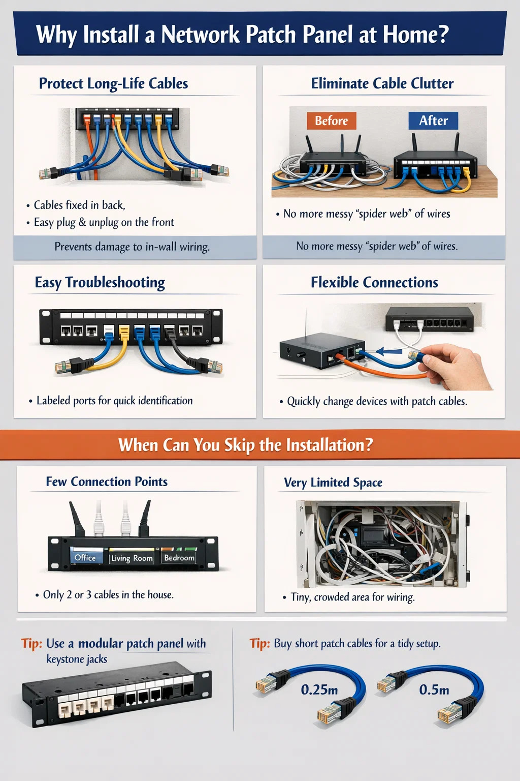 パッチ パネルを取り付けたら、最も適切なセットアップを実現するために、パッチ パネルをスイッチ/ルーターに接続するための 0.25 メートルまたは 0.5 メートルの超短いネットワーク ケーブル (パッチ ケーブル) を必ず購入してください。