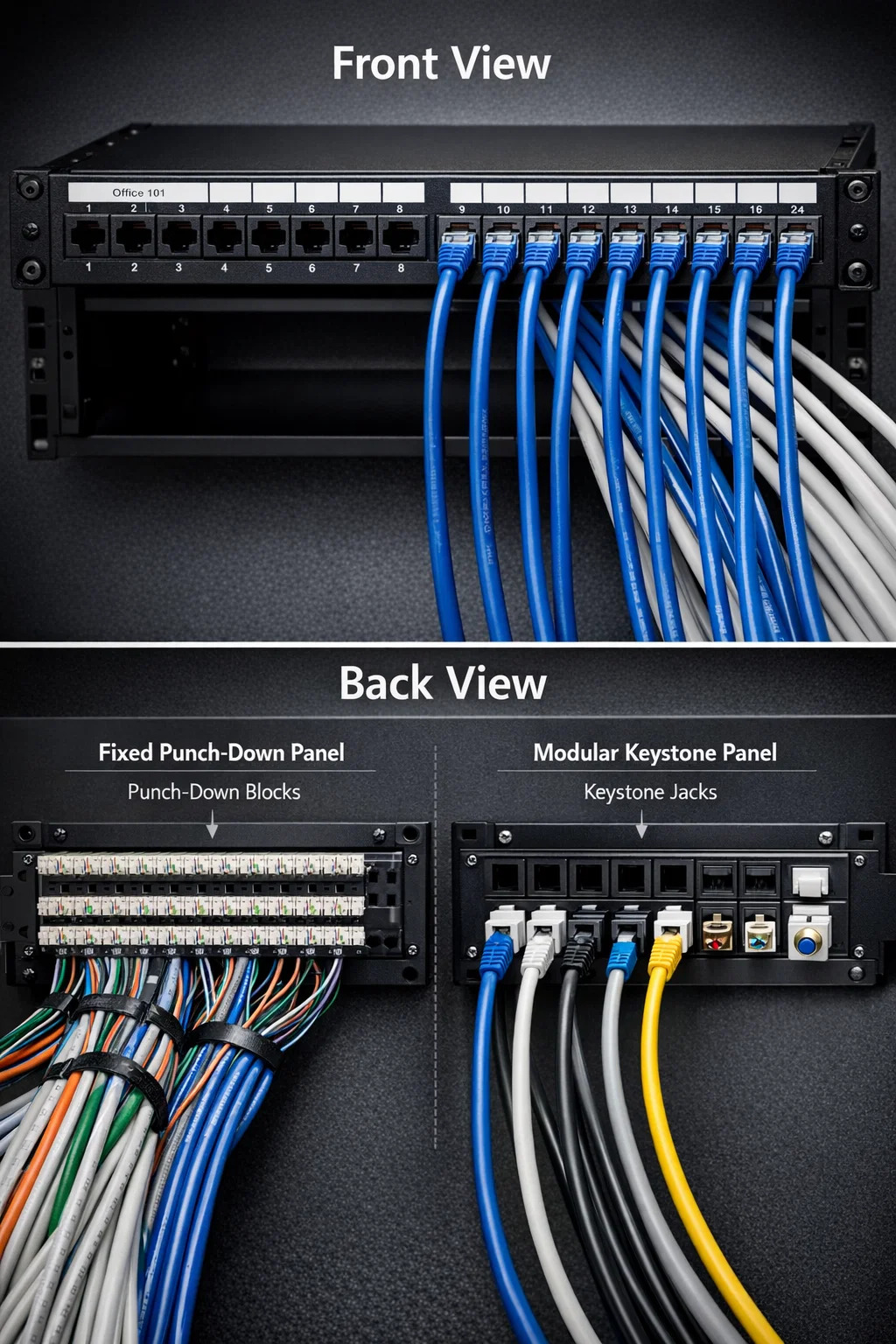 の視覚的なアイデンティティを理解するには、 ネットワークパッチパネル 、ユーザー側の前面とインフラストラクチャ側の背面という 2 つの異なる側面に分類すると役立ちます。
