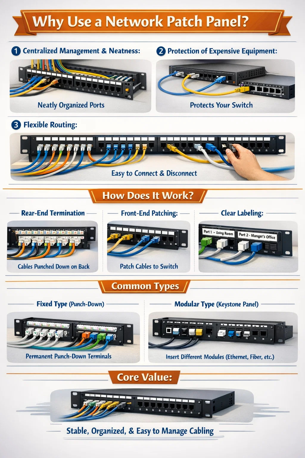 リアエンド終端: 改修中にさまざまな部屋から引き出されたネットワーク ケーブル (通常は Cat6 または Cat6a) は、パッチ パネルの背面で「終端」されます。このプロセスは「パンチダウン」と呼ばれ、ケーブルの端はそこで永久に固定され、動きません。
